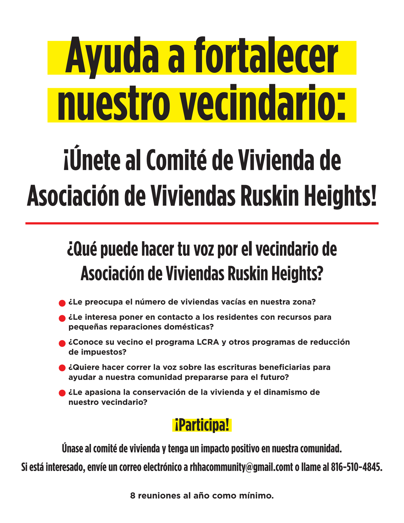 La Asociación de Viviendas de Ruskin Heights invita a los residentes a unirse al Comité de Vivienda y marcar una diferencia positiva en nuestra comunidad.