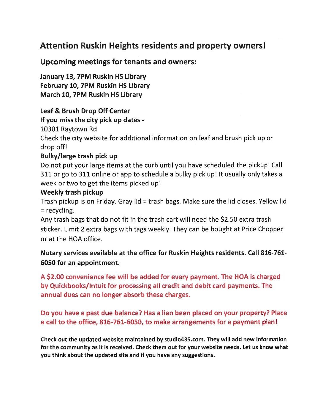 Please review the latest community reminders, upcoming meeting dates, trash and brush guidance, payment updates, and important neighborhood maintenance information.